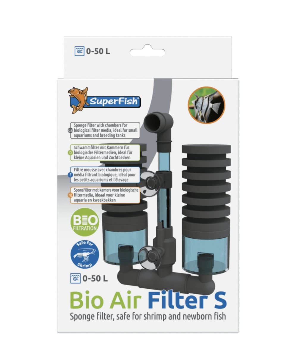 De Superfish Bio Air Filter is een veilige filter voor garnalen en andere kleine vissen. Hij werkt met behulp van een luchtpomp. In het filter zijn twee ruimtes waar eventueel biologische filtermedia aan toegevoegd kan worden. Eenvoudig te installeren en te onderhouden.